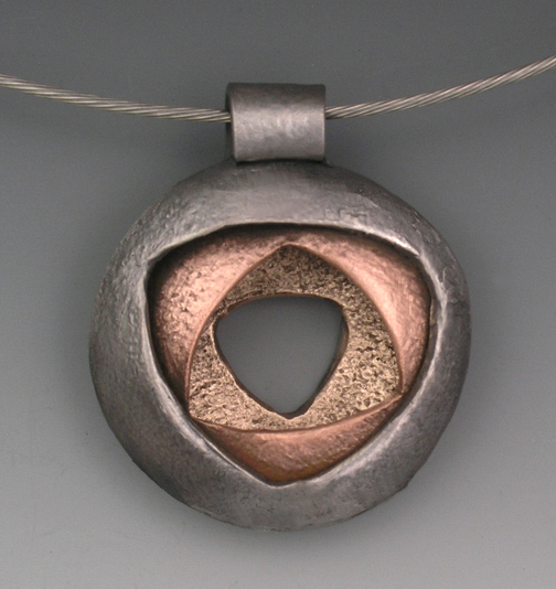 1. Roll a slightly textured layer of steel, 3 cards thick. Cut a circle the size of your choice, and dome it over the doming mold. Using the trillion-shaped cutter or template, cut a trillion shape in the middle.